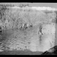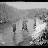 Indigenous people crossing stream, February 25, 1920