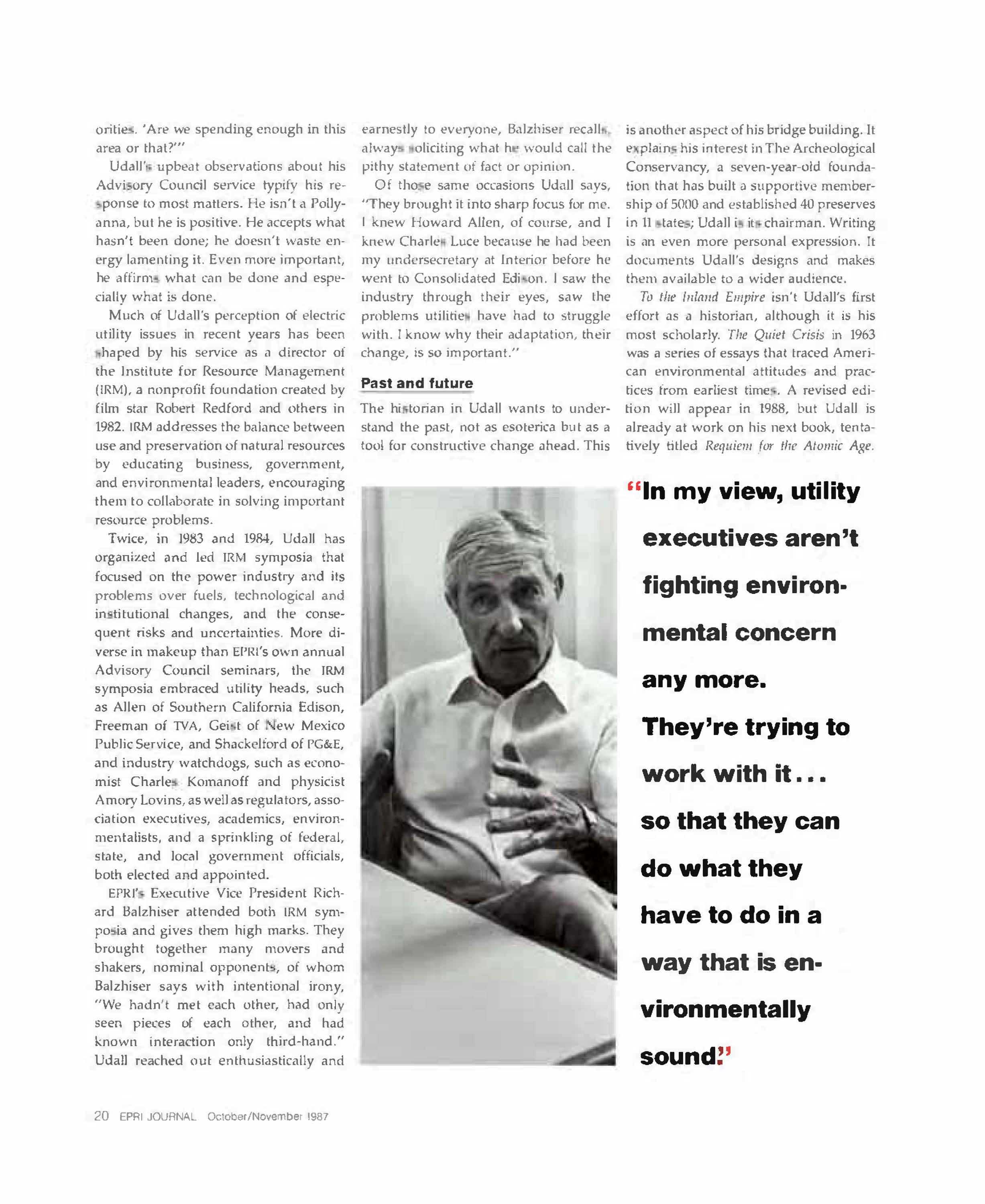 File #7024: "Stewart Udall, Conservationist by Heritage, EPRI Journal, October/November, 1987."