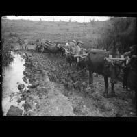 Oxen in mud - wagon in back. Papyrus at right. A sample of road - we have had no rain - but this is simply neglected. [Shantz travel journal, May 6, 1920]