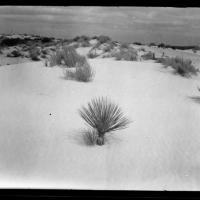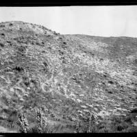 A general view in the sand hills area at Zoutpan, showing mostly scarrered yellow-leaved proteas and tall, large-flowered ericas. There are also a few sheep in the background.