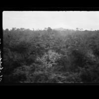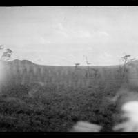 Out across river bottom, with bananas, sugar cane and some plantings, open trees and grass - and open forest hills in back. [Shantz travel journal, Apr. 19, 1920]