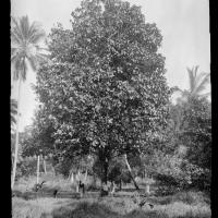 Large narrow leaf mango in the fore. Small young cocoanuts (madafu) in the fore with the small used for milk while green (kitambi) just back. [Shantz travel journal, Apr. 5, 1920]