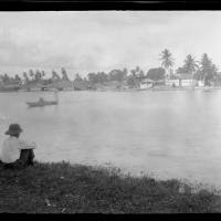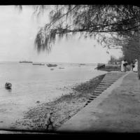 Shore and dhows at Zanzibar - the slender Casuarina showing at the top of the photo. Mainland also shows in the back. [Shantz travel journal, Apr. 5, 1920]
