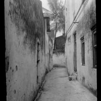 A narrow street with typical door .... A detail of the door - shows fine wood carving and brass work. Hundreds of these doors in Zanzibar. Lock at back. [Shantz travel journal, Apr. 4, 1920]