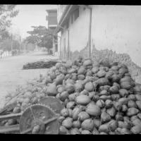 A pile of cocoanuts at the side of the street on ocean front. [Shantz travel journal, Apr. 5, 1920] Cocoanuts are a crop of prime importance and are planted everywhere. The island looks wooded - and is - but mostly with Casuarina, cocoanut, clove,…