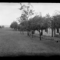A photograph of a street scene in Prieska, showing pepper trees, eucalyptus, and low plastered houses.