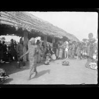 A photograph of indigenous people walking on a road with produce to take to the market. Early on Saturday morning the natives on the east side of the river come across to the market. Here they arrange goods inside of a fence and the natives buy -…