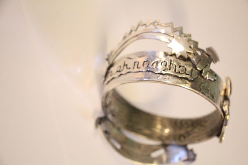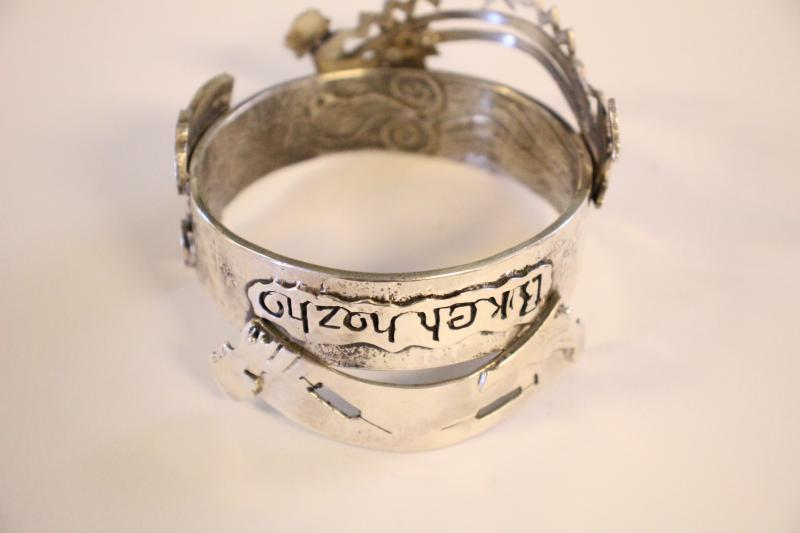 Multiple up-close photographic shots highlighting different sides of a silver cuff bracelet.