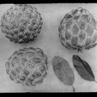 A photograph showing detail of three annona fruit and leaf. It's a common fruit throughout this area.