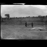 A photograph of a thorn veld with two indigenous people standing in the foreground. One of them is carrying an empty bottle on his head.