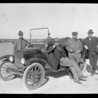 A photograph of the three Americans who were in the elephant camp, H.C. Raven, E.M. Thierry and Homer Shantz, sitting on a dead elephant.