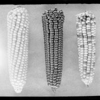 A photograph of three typical ears of corn from the market from left to right: white and blue, red, and white flint.