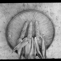 A photograph of three ears of corn laying in a shallow basket with the husks drawn back.